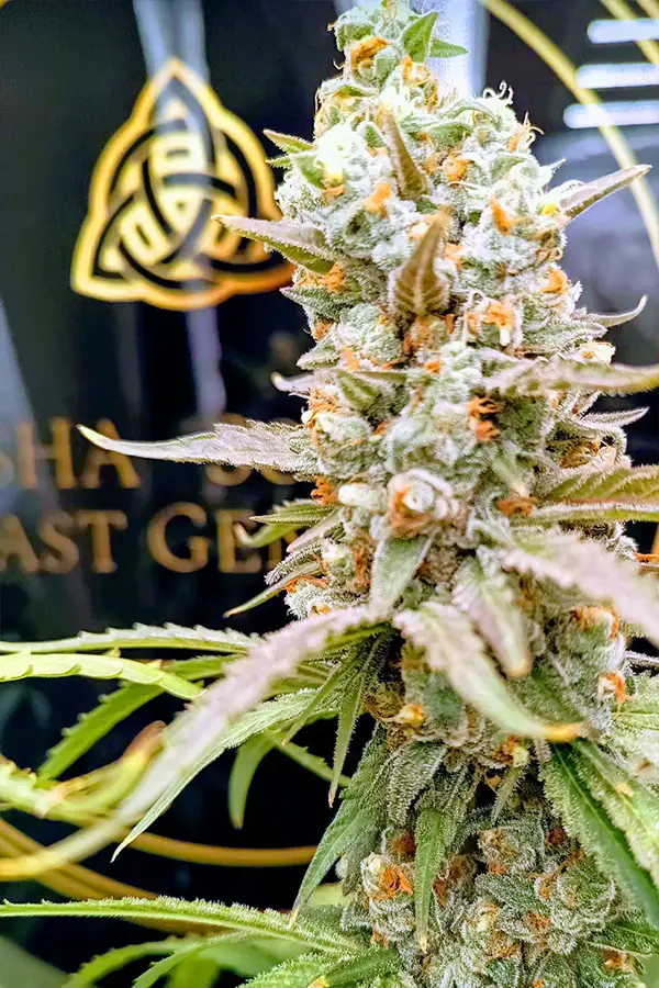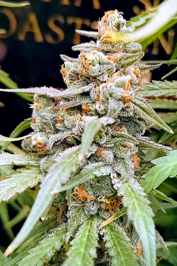 The plant develops a compact yet well-structured frame, with strong lateral branching and dense internodal stacking. Flowers are medium to large in size, heavily resin-coated, and often display dark green tones accented by purple hues toward late flowering. Trichome coverage is consistent and evenly distributed across calyxes and sugar leaves.